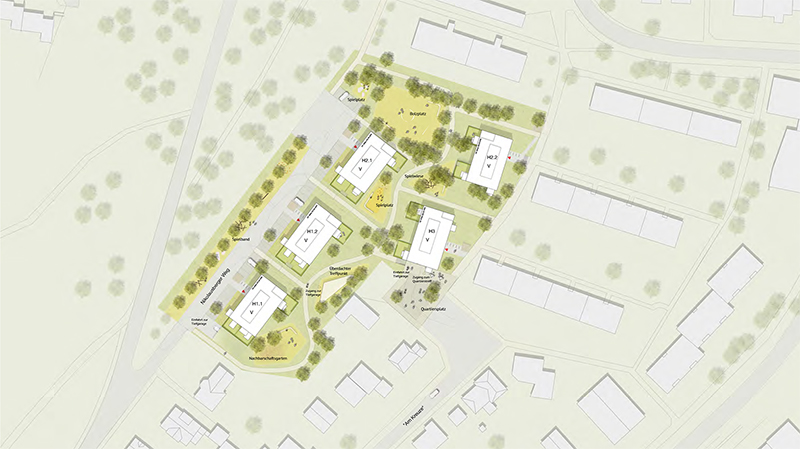 Das Baugebiet befindet sich an der Schnittstelle von kleinmaßstäblicher Wohnbebauung im Süden und der zeilenförmigen Wohnbebauung im Norden und Westen. Die Neubauten nehmen die Baufluchten der bestehenden Bebauung auf und ergänzt diese. Kurze kompakte Baukörper, senkrecht zum Hang angeordnet, fügen sich in die Topografie ein. Die offene Baustruktur ermöglicht die Verbindung mit der Nachbarschaft über die Freiräume im Osten und Norden und eine Anbindung an den Grünzug im Westen.