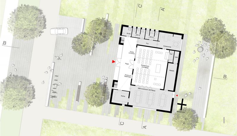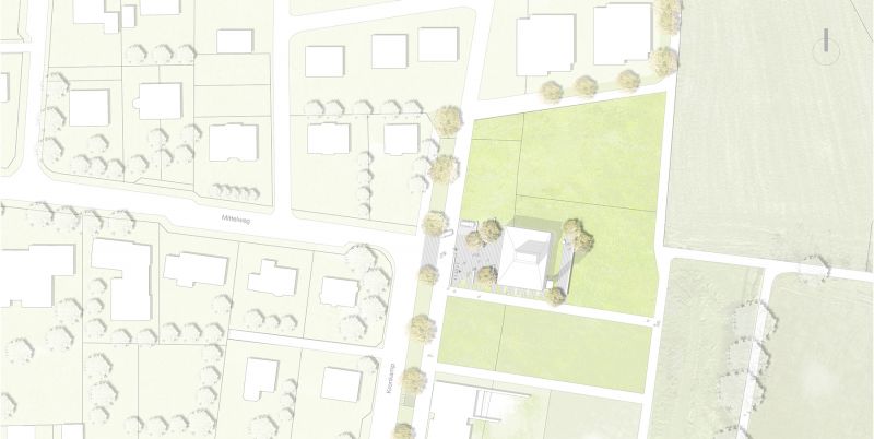 Am neuen Standort im Kronkamp befindet sich das Gemeindezentrum in einer von Einfamilienhäusern, Stadthäusern und zukünftig angrenzenden Geschosswohnungsbauten geprägten Nachbarschaft. Der Entwurf passt sich in die vorhandene, dörfliche Struktur ein, indem er die Maßstäblichkeit der Umgebung wahrt und grundsätzliche, formale Merkmale der umliegenden Gebäude aufnimmt. In der Architektur des Gebäudes werden diese Merkmale – geneigte Dachflächen auf einem eingeschossigen, rechteckigen Baukörper - zu einer individuellen Form ausformuliert, die sich selbstbewusst aus der Umgebung abhebt. Trotz der ausdrucksstarken Form wirkt das Gebäude bescheiden und zeitlos. Im Grundsatz ist der Entwurf von Einfachheit geprägt, die mit wenigen, deutlichen