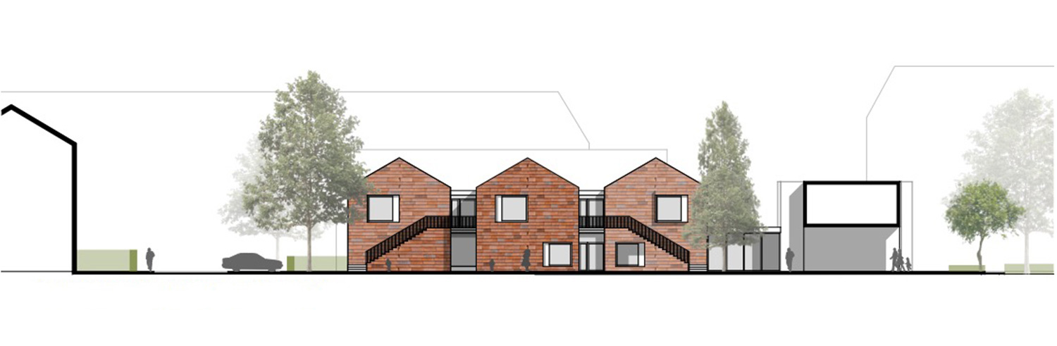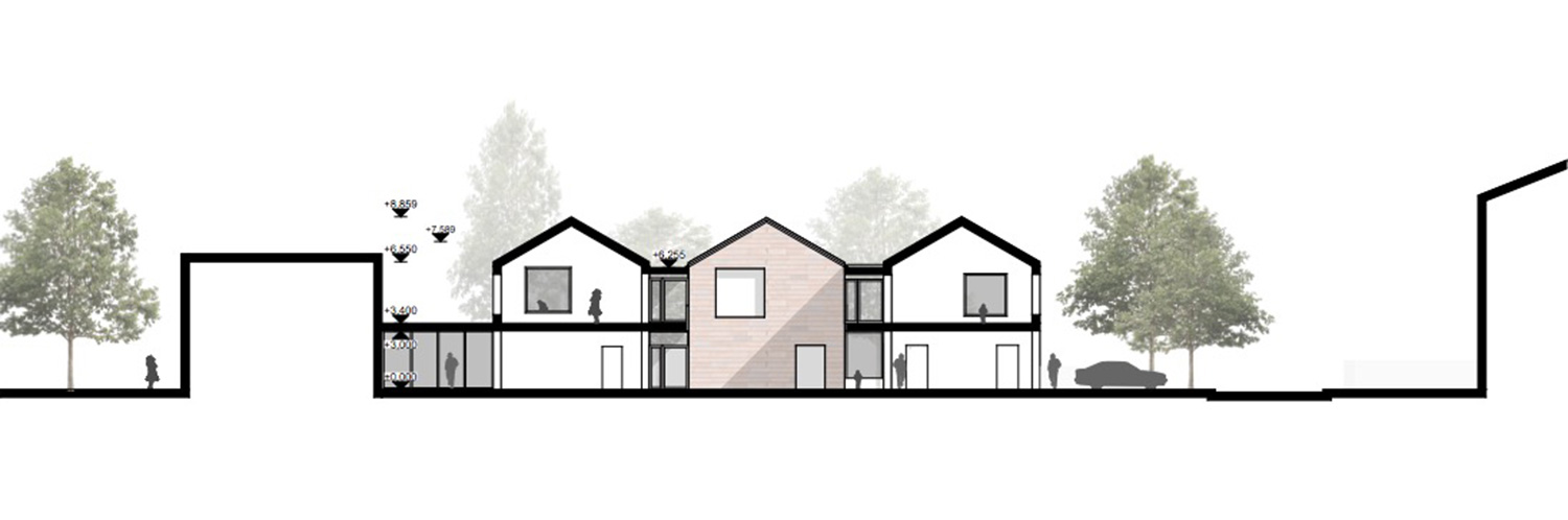 Der Neubau besteht aus drei nebeneinander parallel angeordneten Baukörpern. Diese werden zueinander versetzt platziert um den Baumschutz zu gewährleisten und unterschiedliche Außenräume auszubilden. Sie vermitteln zugleich zwischen den Höhen der Gemeindestraße und der Kubatur der umliegend Zeilenbauten und nehmen mit den entstehenden Hofsituationen Bezug auf die Hoftypologien der Ortsmitte.