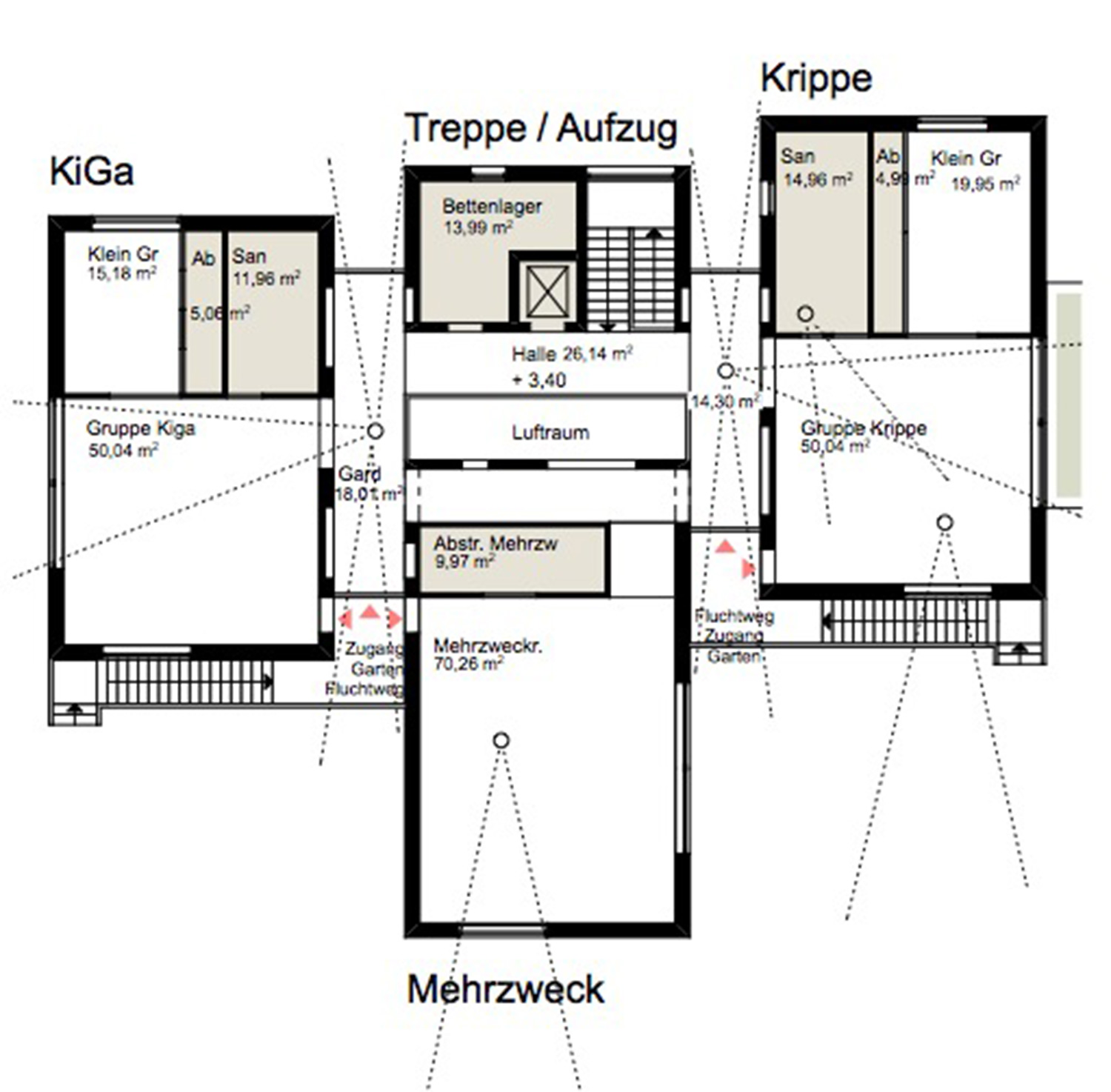 Das Raumprogramm wird auf zwei Etagen so arrangiert, dass jeweils eine Gruppeneinheit bestehend aus Gruppenraum, kleinen Gruppenraum, Sanitärraum, Abstellraum in einer Etage in einem Haus Platz findet. KiTa, Krippe und Mehrzweckraum profitieren von der Atmosphäre der Dachräume, während die integrierte Gruppe umstandslos im Erdgeschoss erschlossen wird. Vor der jeweiligen Gruppeneinheit in den „Fugen“ zwischen den Häusern sind die Garderoben untergebracht. Die Garderobenmöblierung wird in die Wand eingelassen.