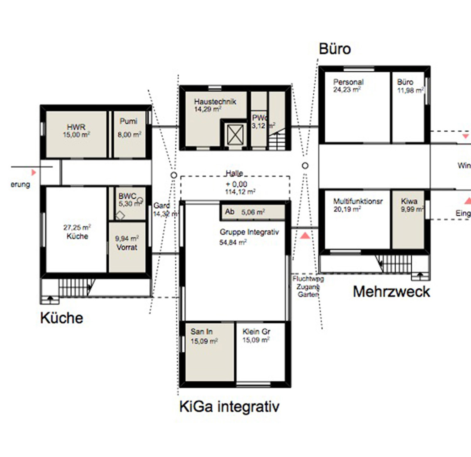 Zwei Freitreppen im Süden des Gebäudes verbinden die Aufenthaltsräume des Obergeschosses direkt mit dem Garten und dienen als 2. Rettungsweg. Die Organisation des Gebäudes erfolgt so, dass alle Gruppenräume zu den Freibereichen der Kita orientiert sind. Die Verwaltung ist im Norden direkt am Eingangsbereich, Küche und HWS im Westen nahe der Anlieferung gelegen. Multifunktionsraum und Mehrzweckraum sind nach Süden orientiert. Nahezu alle Räume liegen an der Außenfassade und sind natürlich belüftbar und belichtbar.