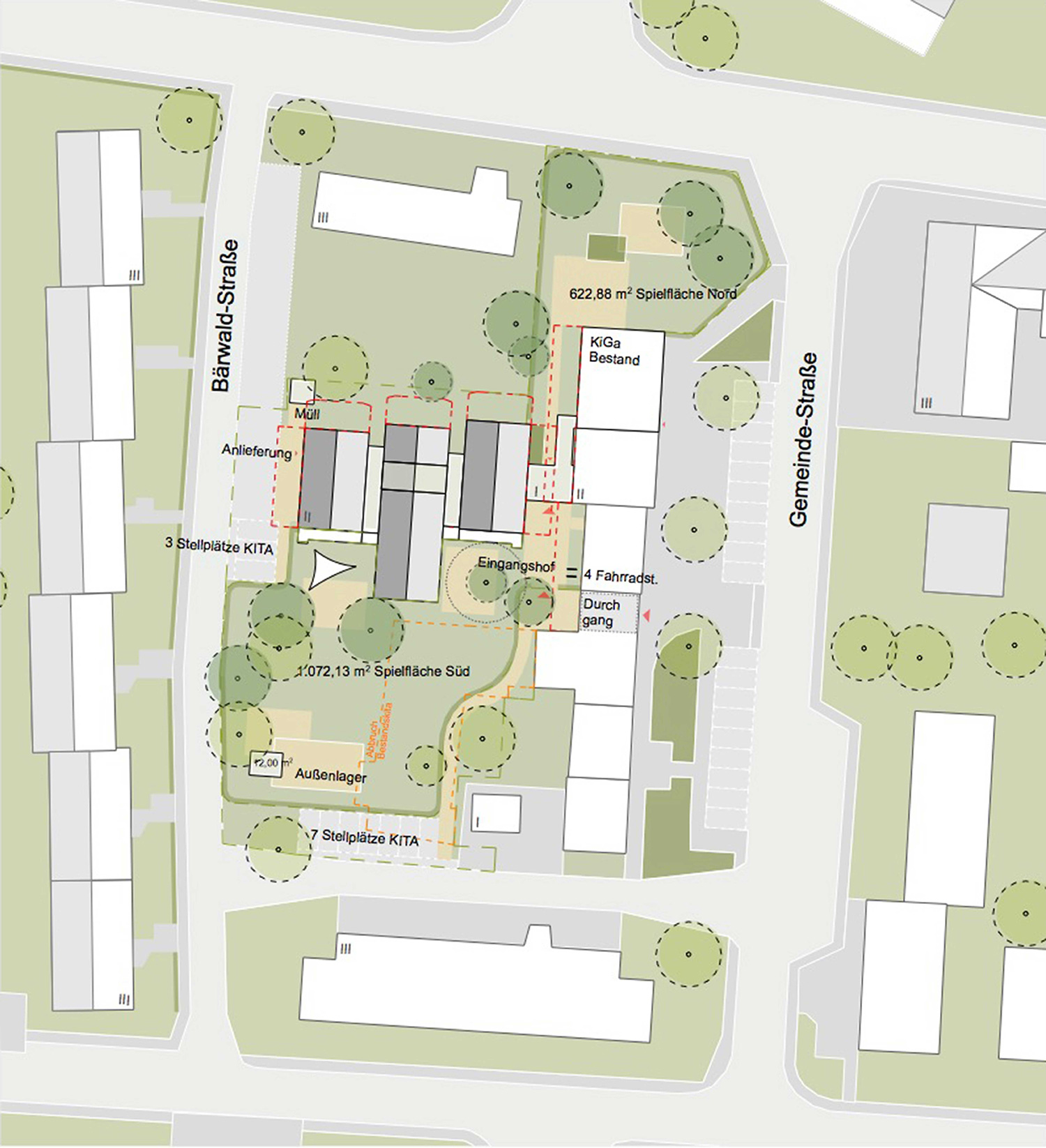 Auf der Ostseite entsteht ein zentraler Eingangshof der Raum lässt zum Ankommen und Verweilen ein und das Abstellen der Fahrräder am Haupteingang ermöglicht. Er wird erreicht über die bestehende Durchfahrt zur Gemeindestraße und einen Weg von der Südseite des Grundstücks, wo sich der wesentliche Teil der Stellplätze für die Kita befindet. Weitere Stellplätze, die Anlieferung und der Müllstandort sind auf der Westseite des Gebäudes an der Bärwaldstraße über einen Nebeneingang erreichbar.