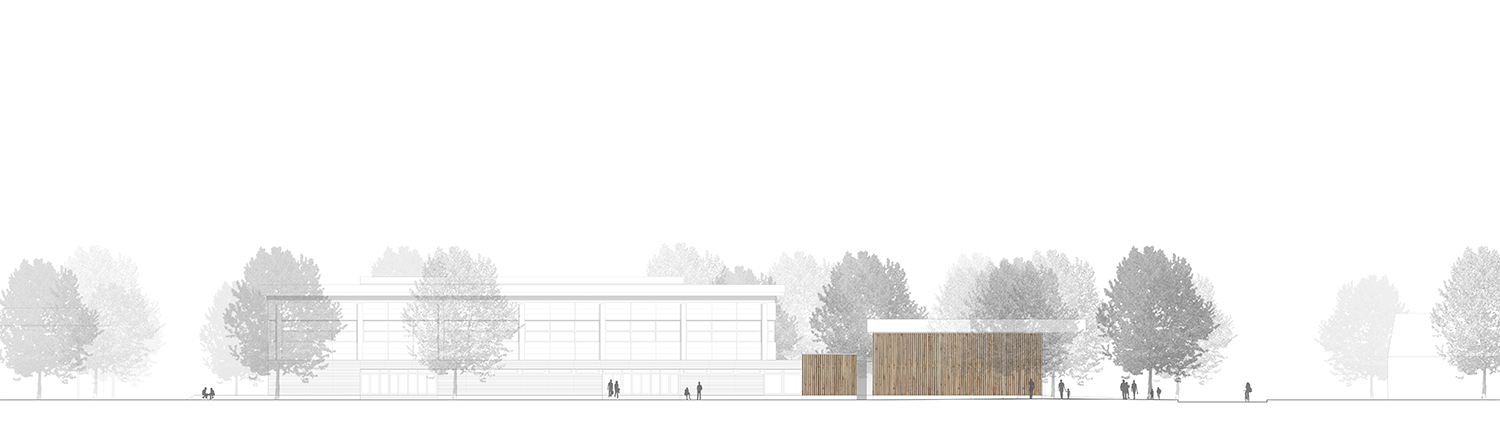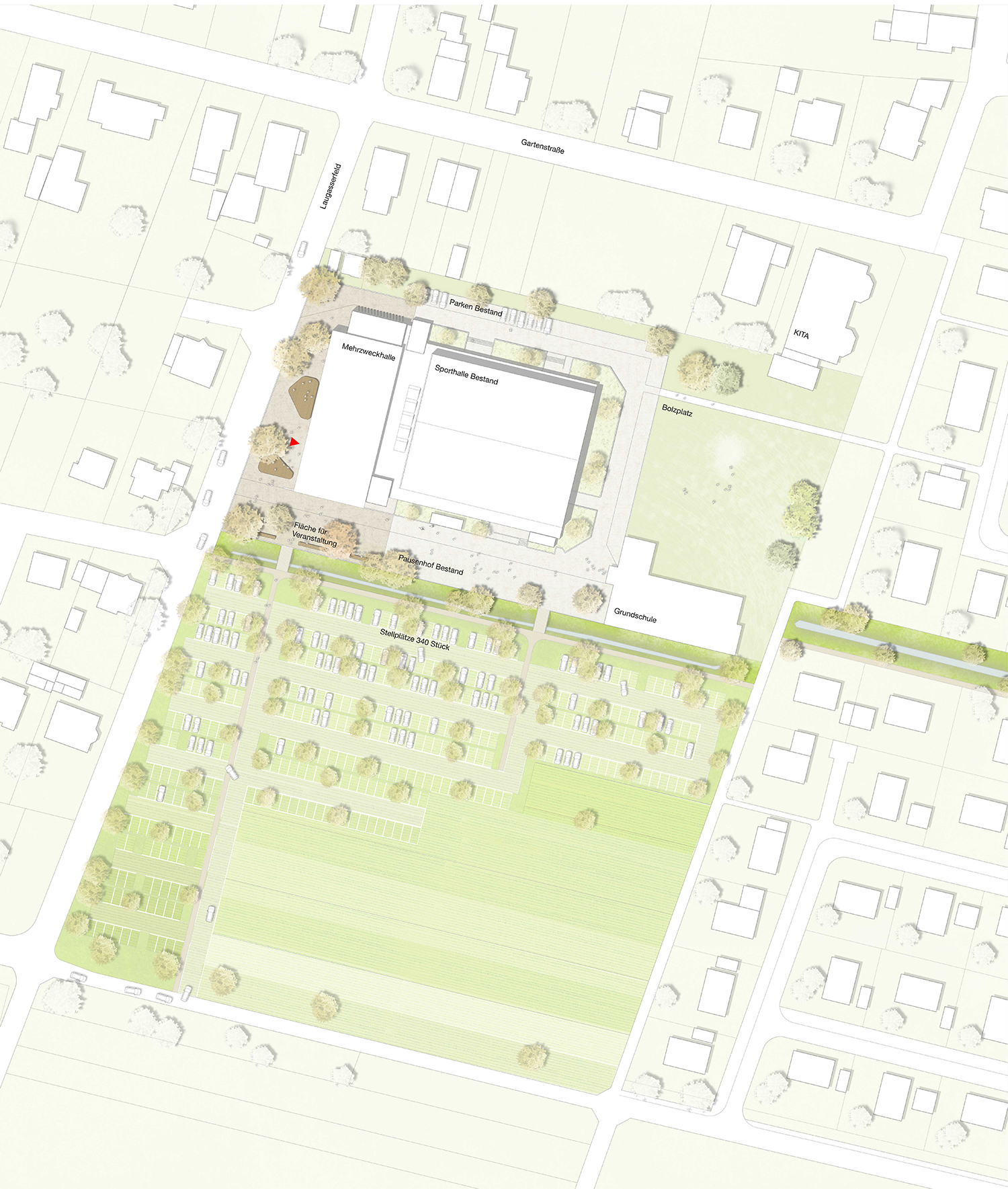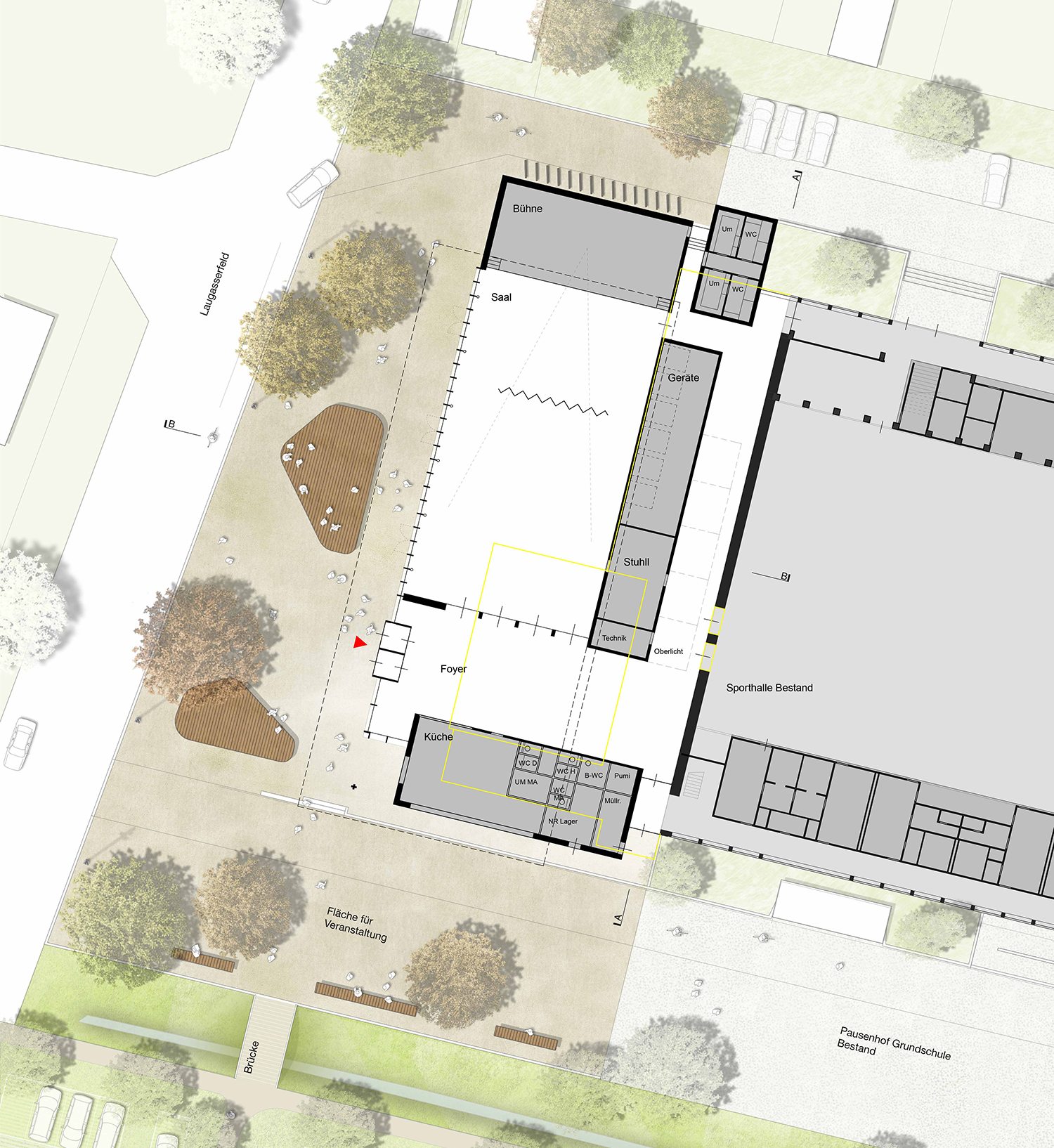 Mit dem Neubau soll eine für beide Hallen (Neubau und Bestandshalle) repräsentative Zugangssituation geschaffen werden, welche die unterschiedlichen Bewegungsrichtungen – Zugang von Norden / aus Richtung des Ortskerns und der neuen Parkierung im Süden, sowie den Zugang zur Grundschule nach Osten berücksichtigt.