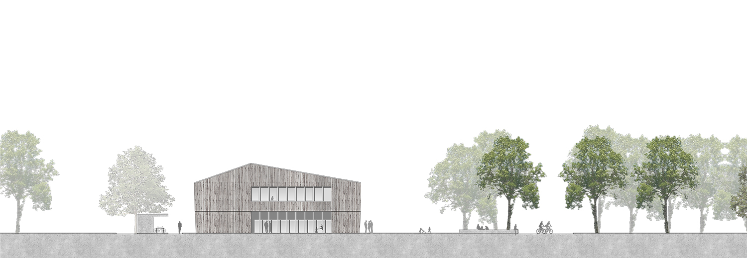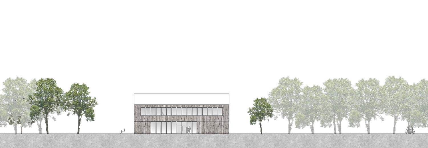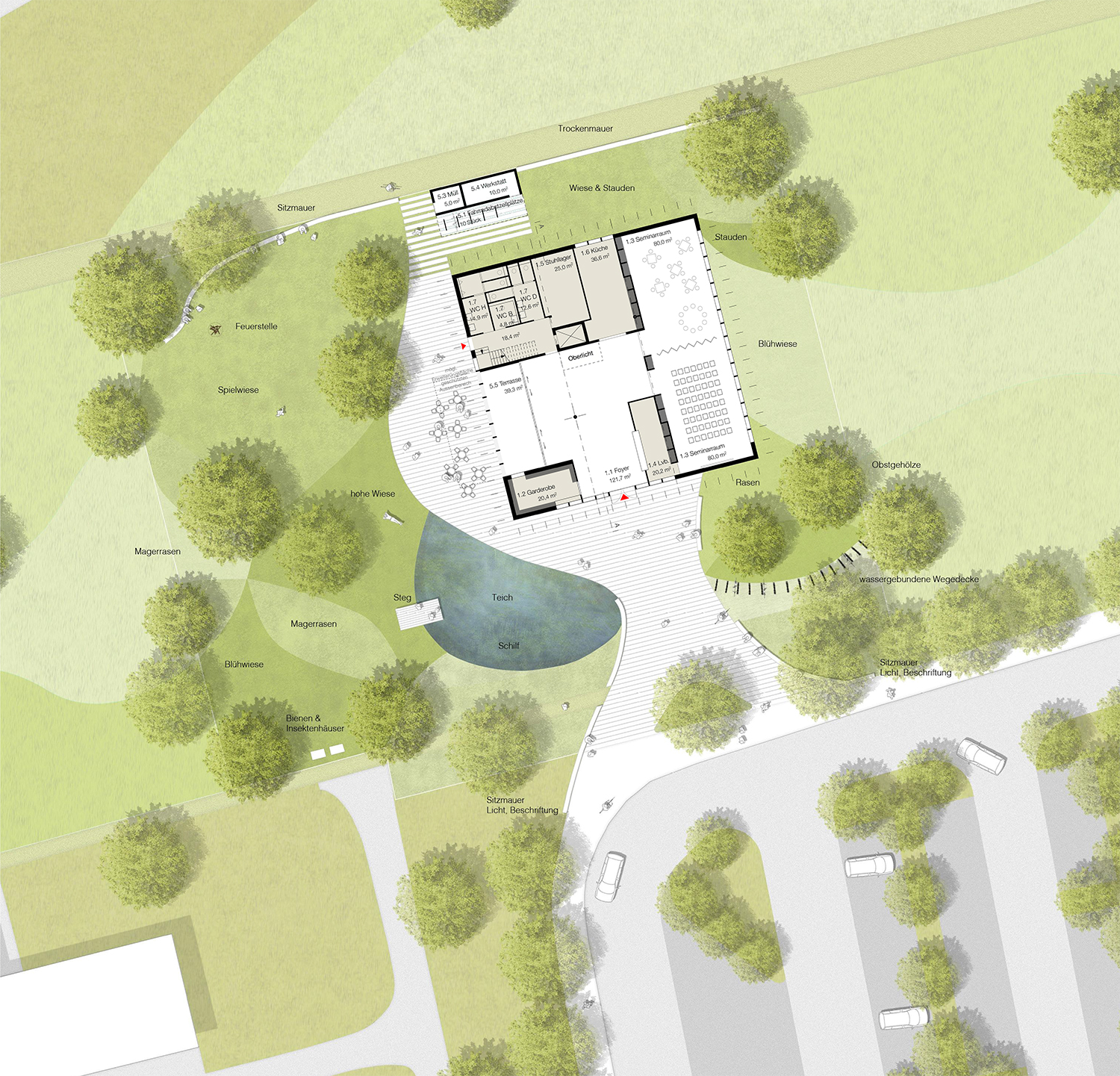 Die Fassadengestaltung kombiniert Offenheit mit einer gewissen ernsthaften Sachlichkeit. Der Baukörper vermittelt das Bild einer modernen Scheune, die die Solarflächen mühelos integriert. Insgesamt hat der in hoher Detaildichte ausgearbeitete Entwurf funktional und ökologisch stark überzeugt und entspricht durch seine Schlüssigkeit dem Image, dass das Umweltbildungszentrum vermitteln will.