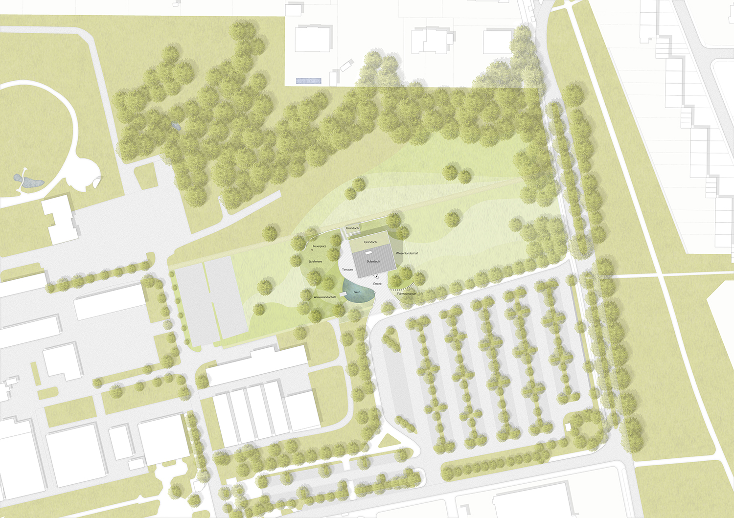 Die städtebauliche Einbindung erfolgt über eine einladende Erschließung, die alle ankommenden Verkehrsmittel regelrecht einsammelt. Die Durchwegung des Grundstücks verzahnt sich organisch mit dem Gebäude, indem sie nicht nur zum Haupteingang hinführt, sondern auch den überdachten Freibereich und einen Nebeneingang erschließt. Durch diese Erschließung über einen kleinen Platz, der auch das Wasser und die Landschaft thematisiert, wird der nördliche und südliche Bereich verbunden. Die organische Gestaltung der Freianlagen ist gut durchgearbeitet.