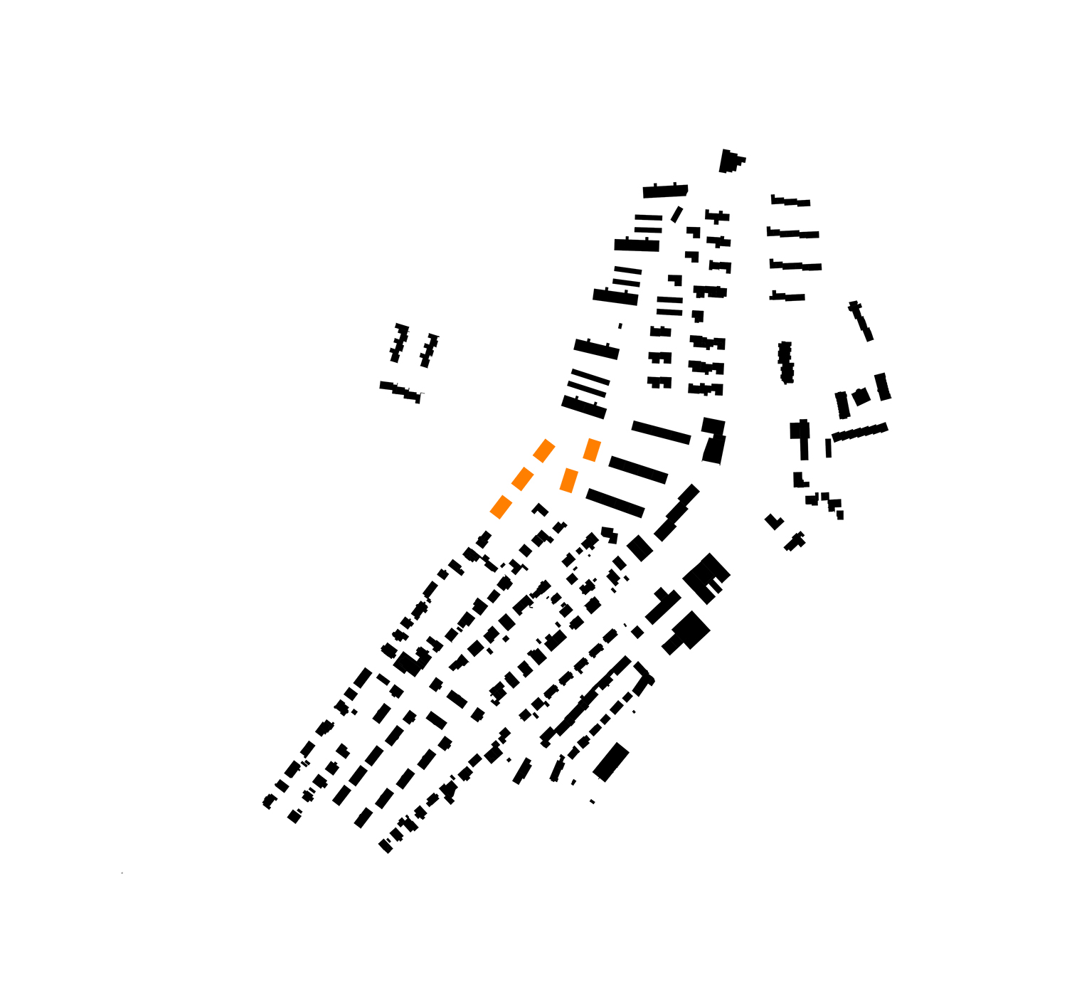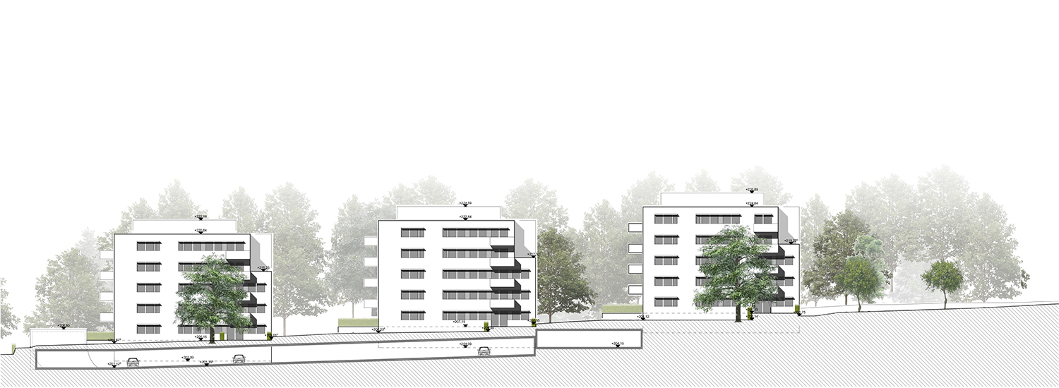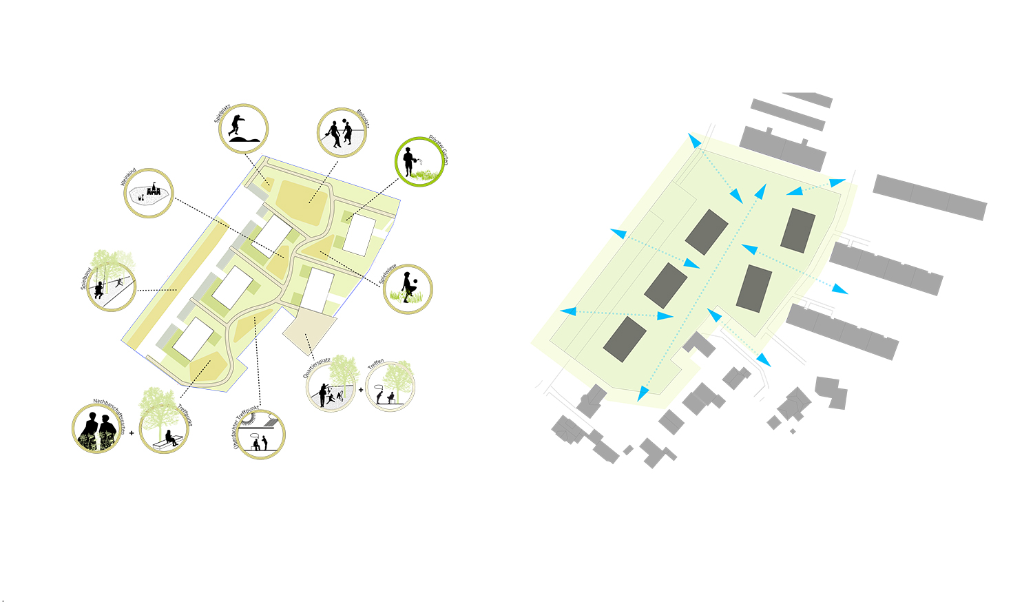 Das Baugebiet befindet sich an der Schnittstelle von kleinmaßstäblicher Wohnbebauung im Süden und der zeilenförmigen Wohnbebauung im Norden und Westen. Die Neubauten nehmen die Baufluchten der bestehenden Bebauung auf und ergänzt diese. Kurze kompakte Baukörper, senkrecht zum Hang angeordnet, fügen sich in die Topografie ein. Die offene Baustruktur ermöglicht die Verbindung mit der Nachbarschaft über die Freiräume im Osten und Norden und eine Anbindung an den Grünzug im Westen.