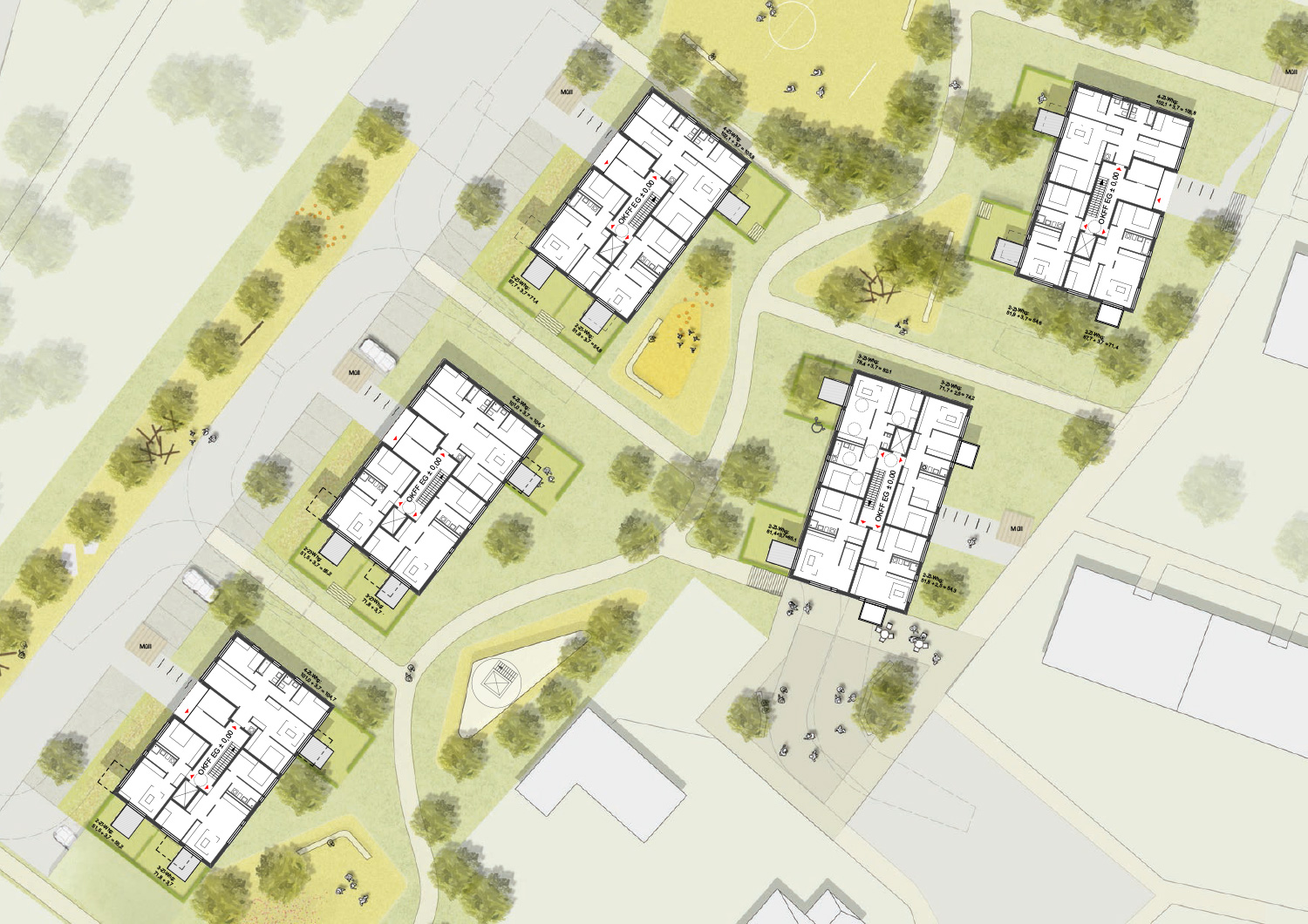 Der besondere Reiz des Gebietes sind Offenheit, Weite, Aus- und Durchblicke, der Bezug zum Wald sowie die Hanglage. Diese Merkmale bleiben trotz räumlicher Fassung durch die Neubauten bestehen. Die Neubauten sind so platziert, dass ein großzügiger Park in der Mitte entsteht. In diesem sind Spielbereiche und Nachbarschaftsgärten angelegt. Der bestehende Bolzplatz kann wie gewünscht an dem Ort verbleiben. Mietergärten erhalten durch Hecken ihre räumliche Fassung. Niveauunterschiede zu den Wohnwegen sorgen für zusätzliche Privatheit.
